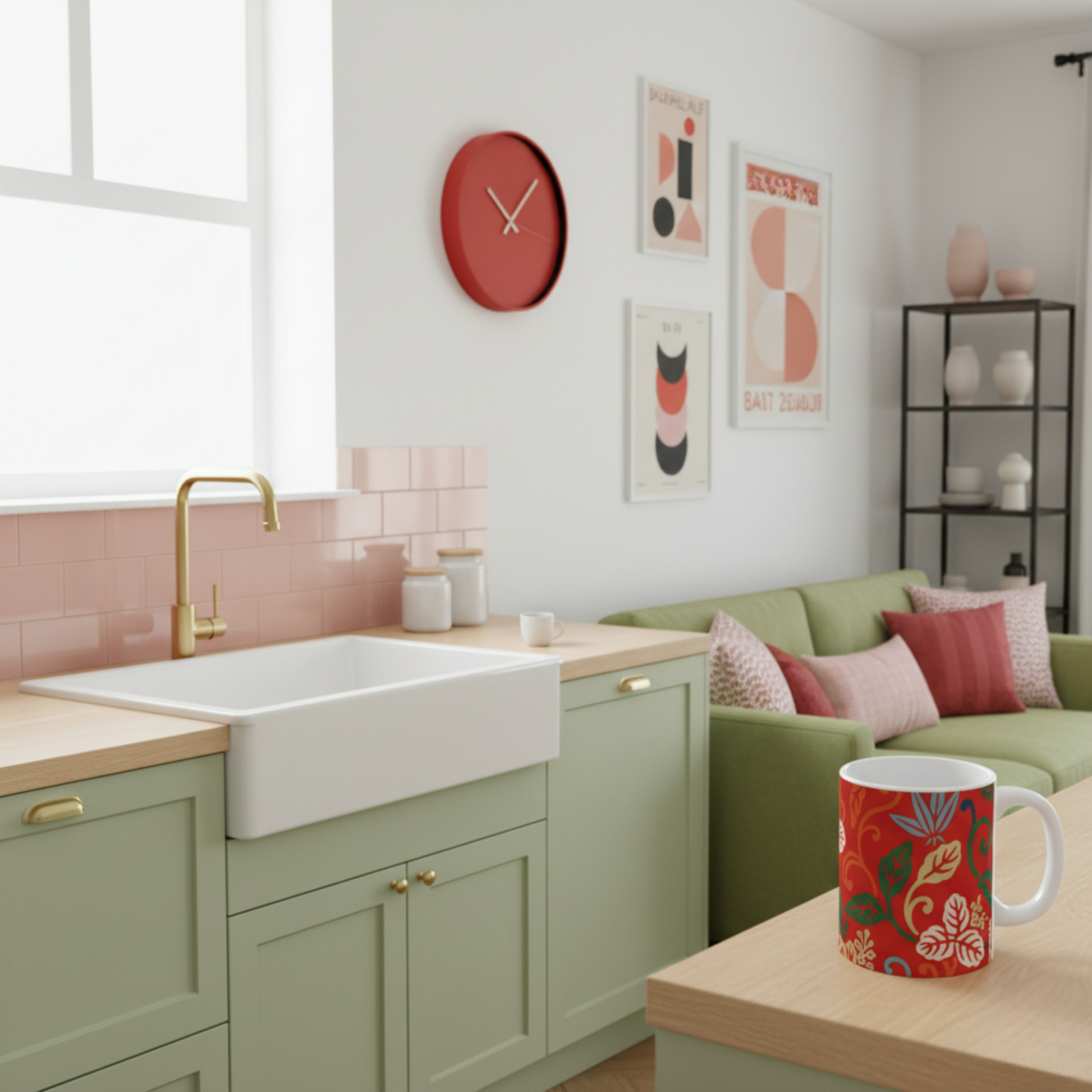 Verleihen Sie Ihrem täglichen Kaffee- oder Teeritual mit dieser Ito Nishiki-Mustertasse (325 ml) kräftige Farben und zeitlose Eleganz. Diese farbenfrohe Keramiktasse ist von traditionellen japanischen Kimono- Textilmustern inspiriert und verfügt über einen lebhaften roten Hintergrund, der mit stilisierten Blättern, Blumen und abstrakten Motiven in satten Grün-, Creme-, Blau- und Goldtönen verziert ist.