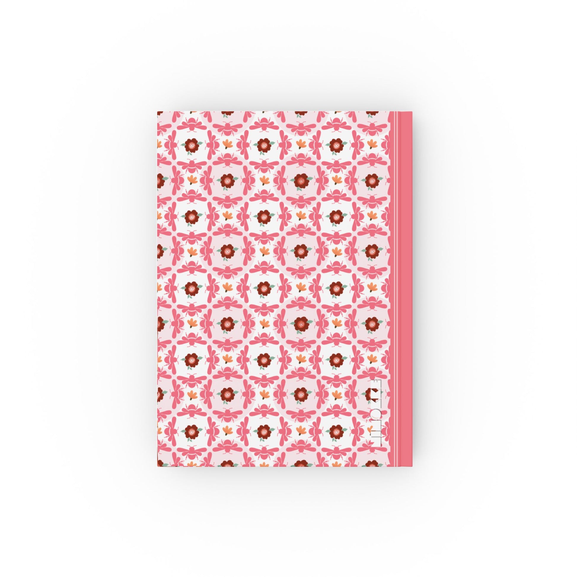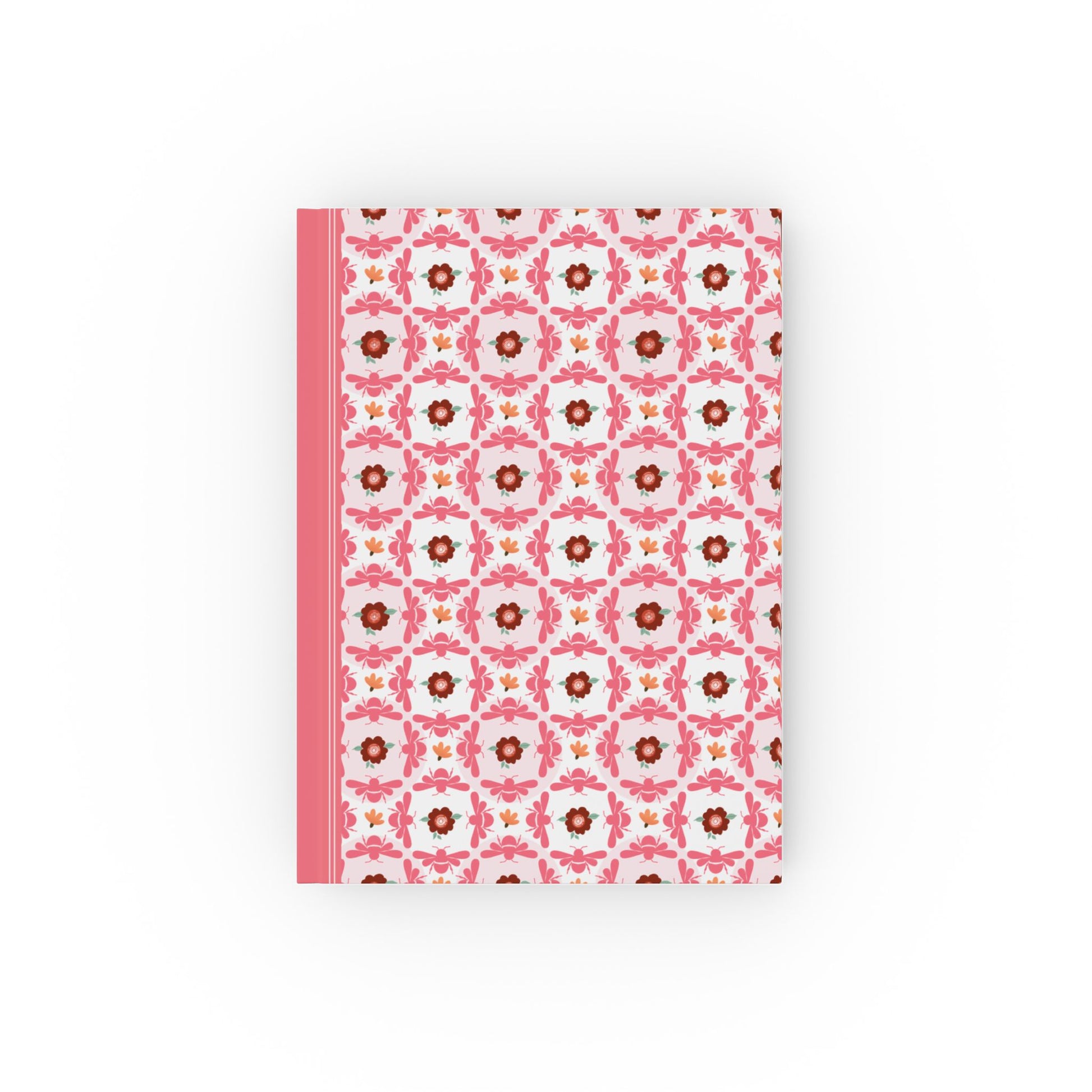 Bring bold elegance to your writing with this hardcover notebook featuring a modern pink bee and floral pattern. The design highlights stylized bees in flight, round floral medallions, and charming accent blooms in warm shades of red, coral, and blush. Perfect for those who love vibrant, artistic stationery with a unique twist.